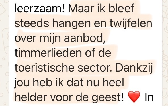 Dan is dit traject júist waardevol. We werken efficiënt, in korte sessies van 45 minuten, en je kunt tussendoor altijd appen. Geen onnodige modules, wel gerichte actie en focus.