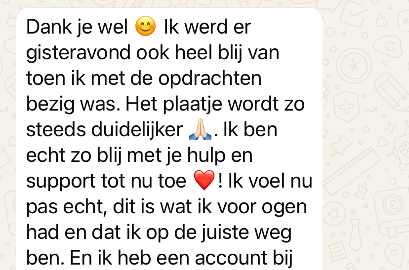 Ik ben er voor je. Je krijgt niet alleen 1-op-1 sessies, maar ook tussendoor support via WhatsApp. Je staat er echt niet alleen voor.